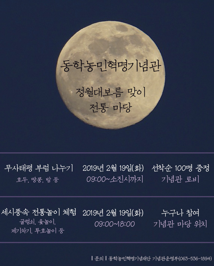 동학농민혁명기념관에서 정월대보름을 맞이하여 전통 마당을 운영합니다. 많은 참여 부탁드립니다.