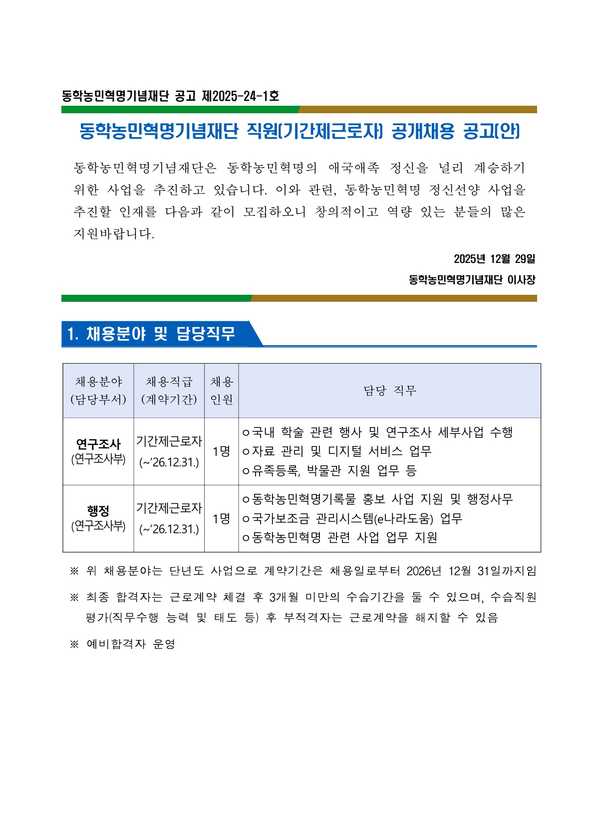 직원(기간제_연구조사 1명, 행정 1명) 공개채용 공고