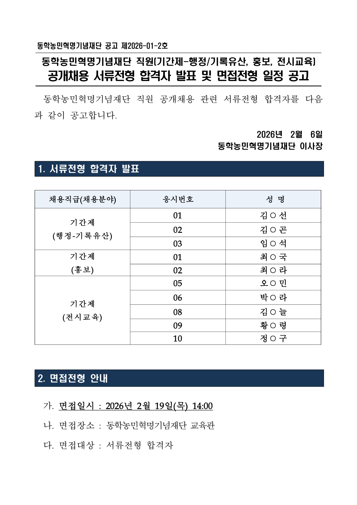 직원(기간제_행정-기록유산, 홍보, 전시교육) 공개채용 서류전형 합격자 발표
