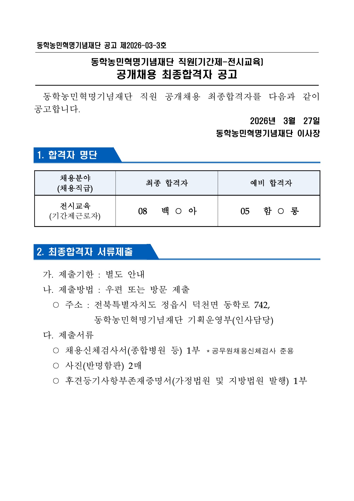 직원(기간제_전시교육) 공개채용 최종 합격자 발표