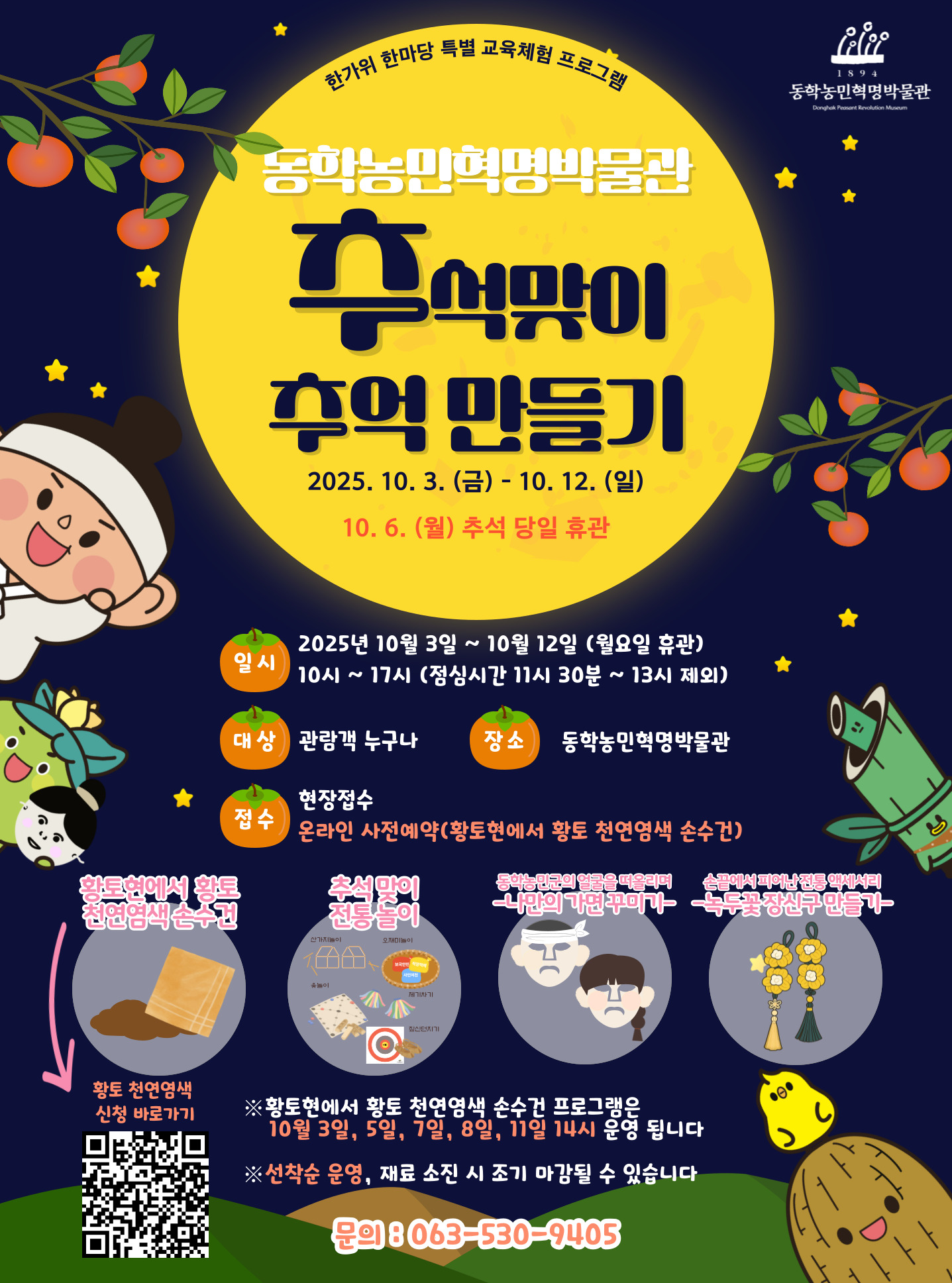 민족 대명절 추석 연휴를 맞이하여 준비한 동학농민혁명기념재단 동학농민혁명박물관 프로그램의 주요 내용은 ▲황토현에서 만드는 황토천연염색 손수건 체험, ▲추석 맞이 전통놀이, ▲동학농민군의 얼굴을 떠올리며 - 나만의 가면 꾸미기, ▲손끝에서 피어난 전통 액세서리 - 녹두꽃 장신구 만들기 등으로 다양하다.