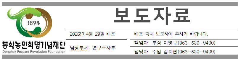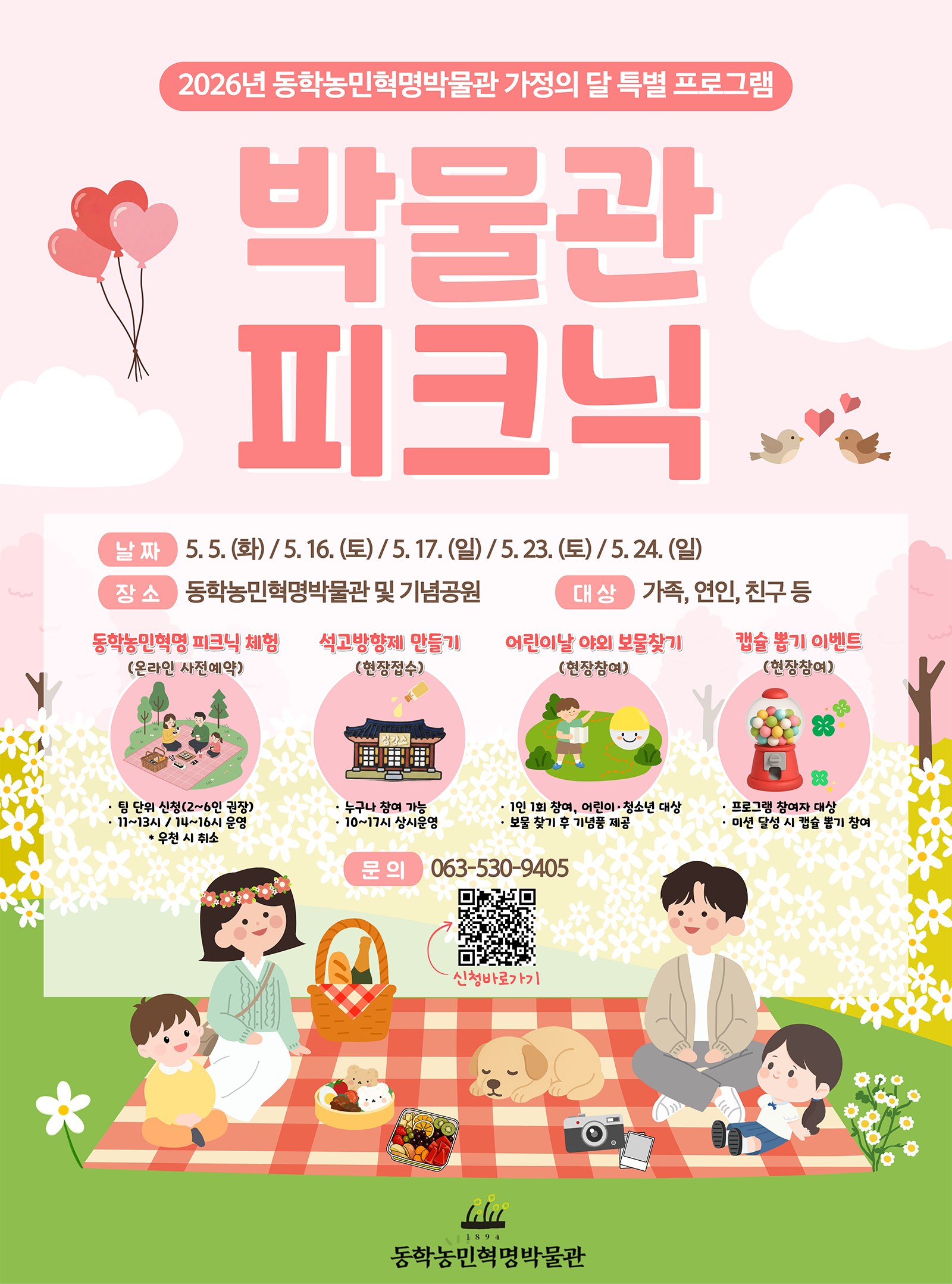 동학농민혁명기념재단(이사장 신순철)은 5월 가정의 달을 맞아 가족 단위 관람객을 위한 특별 프로그램 ‘동학농민혁명 박물관 피크닉’을 운영한다. 이번 프로그램은 5월 5일 어린이날을 비롯해 5월 16일, 17일, 23일, 24일 총 5일간 동학농민혁명박물관 및 기념공원 일대에서 진행된다.