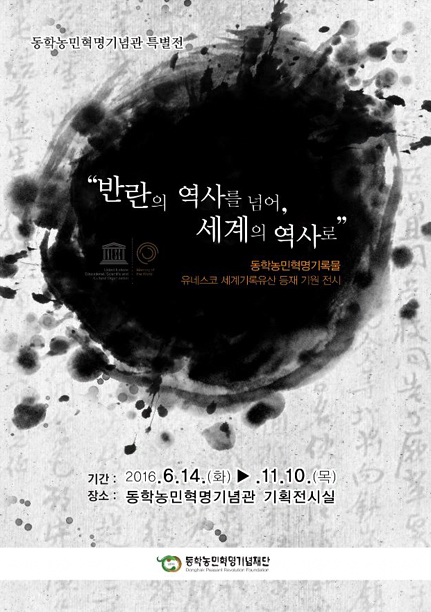 특별전 “반란의 역사를 넘어, 세계의 역사로”는 동학농민혁명기록물의 세계기록유산 등재 기원 전시입니다. 동학농민혁명은 민주·평등·자주·인간존중 등 인류의 보편적 가치를 추구한 세계사적인 의미가 있는 사건입니다. 따라서 이번 전시는 동학농민혁명기록물을 통해 동학농민혁명이 인류가 지켜내야 할 소중한 자산임을 확인하고, 더 나아가 동학농민혁명기록물이 유네스코 세계기록유산으로 등재될 수 있는 초석을 마련하는데 그 목적이 있습니다.