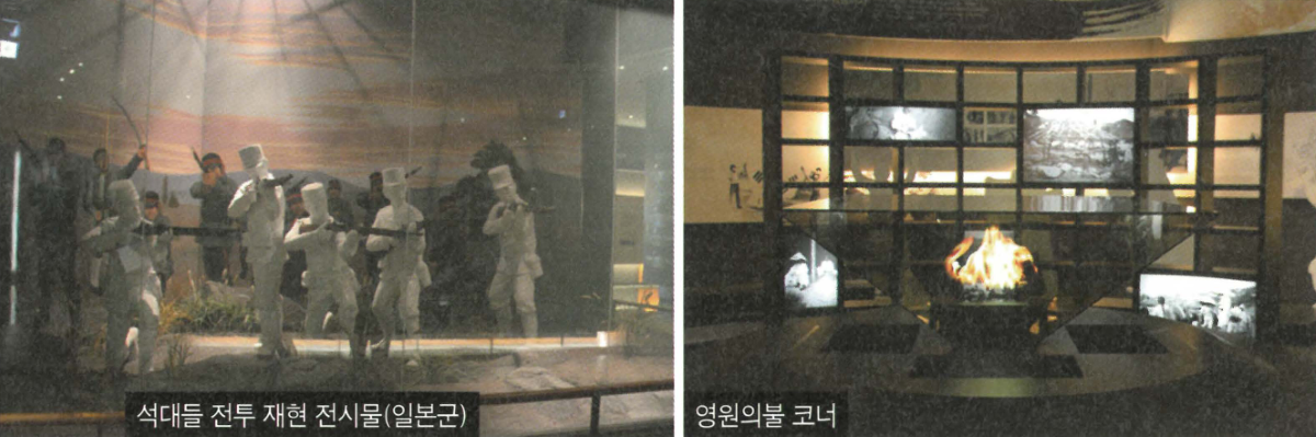 전시실은 전시물과 각종 기록물, 영상을 통해 장홍 동학농민혁명을 집중적으로 소개하는데 중점을 두었다. 농민군과 일본군의 모형을 통로 양쪽으로 전시해 석대들 전투를 재현해 둔 부분에서는 마치 역사 현장의 한복판에 서 있는 듯 한 느낌을 받을 수 있었다. 특히 전시실 마지막을 장식한 [영원의 불]코너는 중앙에 홀로그램으로 표현된 불꽃 너머로 이름이 밝혀진 석대들 전투 희생자 457명의 명단이 보이는 구조가 인상적이었다. 이대흠 운영실장은 아직도 많은 희생자 분들이 밝혀지지 못한 상태지만, 이정도 숫자의 명단을 파악할 수 있었던 것은 장흥사람들에게 흐르는 역사적 핏줄이 있었기에 가능했던 것이라 언급했다.