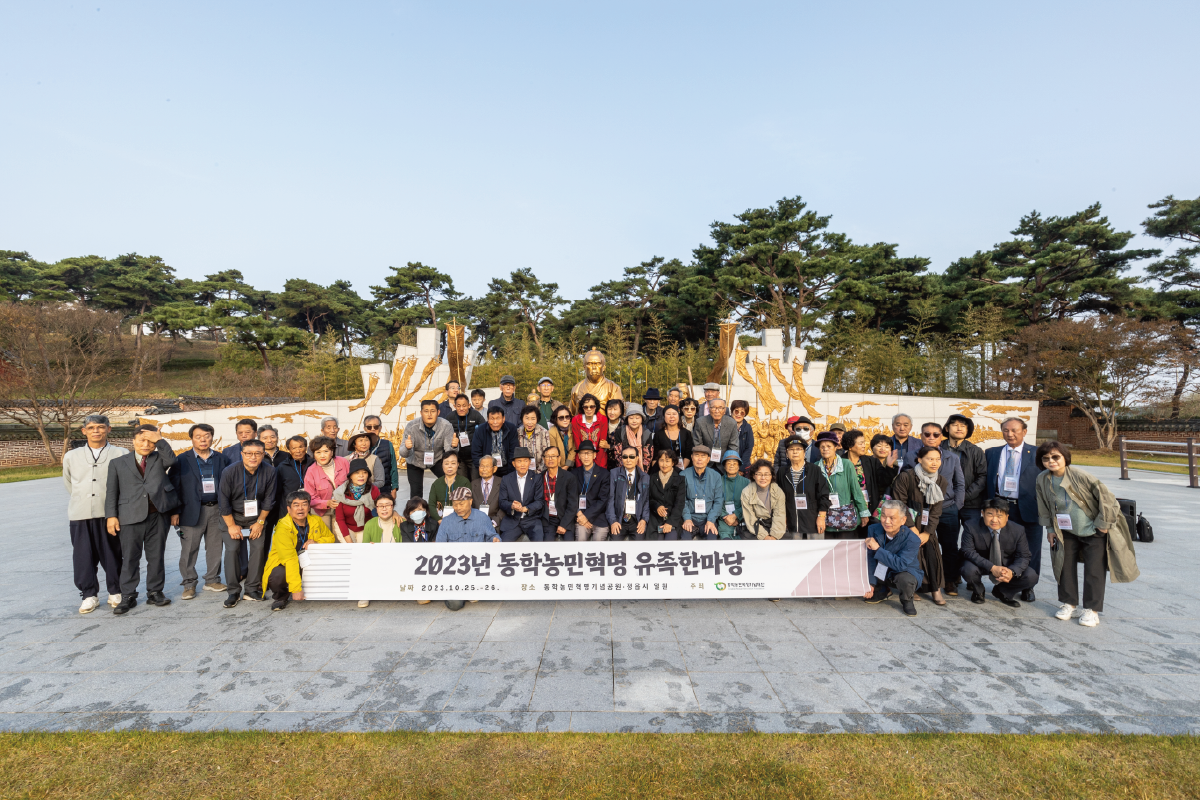 지난 10월 25일부터 26일까지 이틀간 동학농민혁명기념공원 일원에서 동학농민혁명 참여자 유족 100여 명이 참여한 ‘유족 한마당’ 행사가 열렸다. 동학농민혁명 참여자의 숭고한 넋을 기리고, 유족에 대한 예우와 유족으로서의 긍지와 자부심 고취를 위해 열린 이번 행사는 첫째 날 동학농민혁명기념공원 내 추모관 참배를 시작으로 박물관을 돌아보았다. 이어서 전통공연을 관람한 후 체험 프로그램과 유족통지서 전달식에 참여 참여하였다. 둘째 날에는 동학농민혁명기념공원 내 울림의 기둥, 불멸 바람길(전봉준 장군과 동학농민군상) 등의 기념시설과 전봉준 고택 등 정읍지역 유적지를 답사하였다.