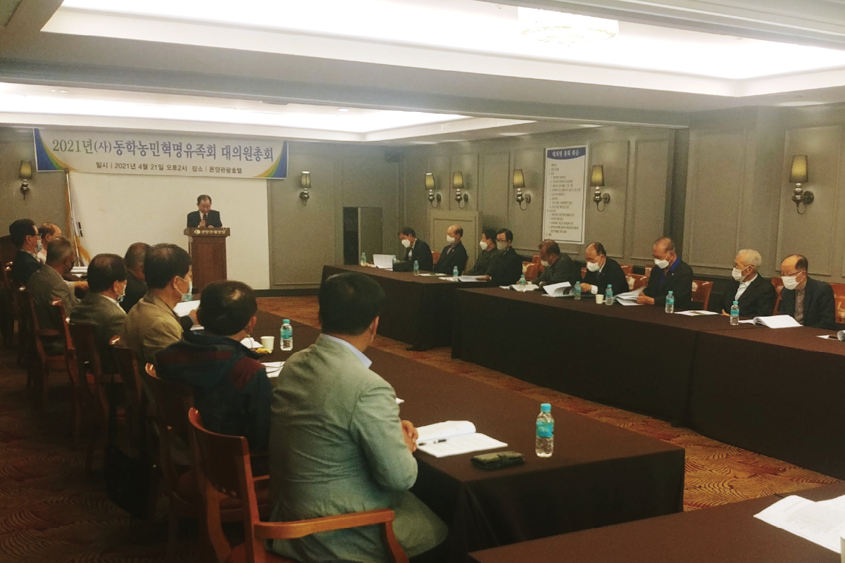 지난 4월 21일 아산에서 (사)동학농민혁명유족회 대의원 총회가 열렸다. 이 날 회의에서는 2020년 업무추진 경과보고, 2021년 사업계획 보고와 함께 전임 이사장 및 이사 해임의 건, 비상대책위원장 및 신임 이사장 선임의 건, 2020년 결산 및 감사보고의 건 등을 심의·의결하고, 제3대 (사)동학농민혁명유족회 임원진과 대의원을 임명하였다. 임원으로 이사장 주영채, 감사 최정길·이정일, 이사 정해곤(사무총장)·김범중·김창식·문영식·박종호·심재식·이정태·송영례·정탄진·함기영을 각각 임명되었으며, 대의원으로는 강성진(광주), 김수호(인천), 김영웅(대전), 박난수(예산), 송기평(정읍), 송옥희(서울), 송준호(청양), 이길로·이용로(전주), 이의석(홍성), 이원하(공주), 이정렬(장흥), 임영섭(안양), 조영범(태안), 최고원(김제), 최기주(임실), 최이기·황대규(아산), 황동우(고창) 등을 각각 임명되었다.