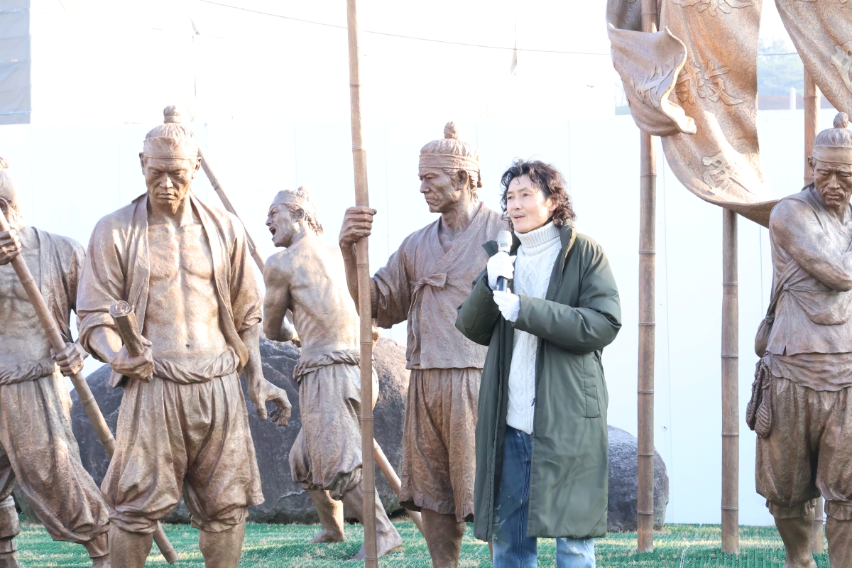 전봉준 장군 동상 ‘의(義)의 깃발 아래’ 개막식에서 작품을 설명하고 있는 국경오 조각가(2024.1.10.)