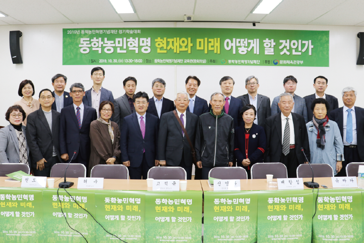 지난 10월 30일 재단 교육관에서 동학농민혁명기념재단 정기학술대회가 “동학농민혁명 현재와 미래, 어떻게 할 것인가”라는 주제로 개최되었다. 이날 학술대회는 이이화 역사학자(전 동학농민혁명기념재단이사장)의 ‘동학농민혁명의 역사’라는 기조강연에 이어 조재곤(서강대 연구교수)- ‘동학농민혁명 국외자료 현황과 활용방안’, 배항섭(성균관대 교수)- ‘동학농민혁명 연구현황과 미래 가치화’, 원도연(원광대 교수)- ‘국가기념일 제정 이후 동학농민혁명 기념사업의 기본방향’ 등 3명의 주제발표가 있었다. 신영우 충북대 명예교수가 좌장을 맡은 종합토론은 이병규(기념재단 연구조사부장), 유바다(고려대 교수), 고석규(목포대 명예교수), 허수(서울대 교수), 신순철(원광대 명예교수), 문병학(기념재단 기념사업부장) 등이 토론자로 참여하였다.
