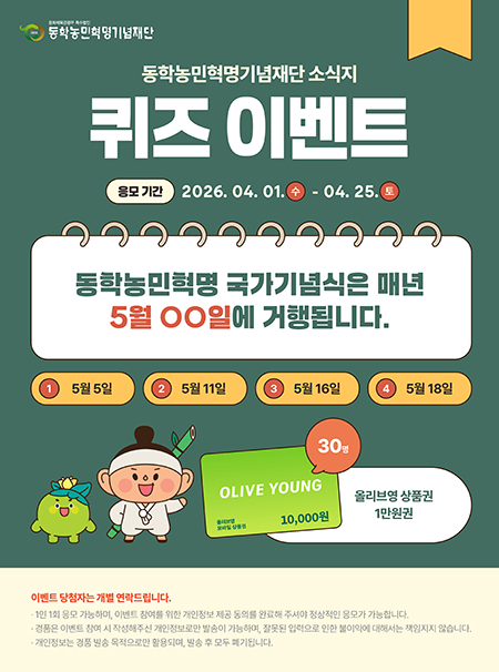2026년 제2기 동학농민혁명기념재단 블로그 기자단 모집 공고 동학농민혁명기념재단에서는 재단의 주요 사업과 다양한 이야기를 국민의 시각으로 전달할 「2026년 제2기 동학농민혁명 블로그 기자단」을 다음과 같이 모집하오니 많은 관심과 참..