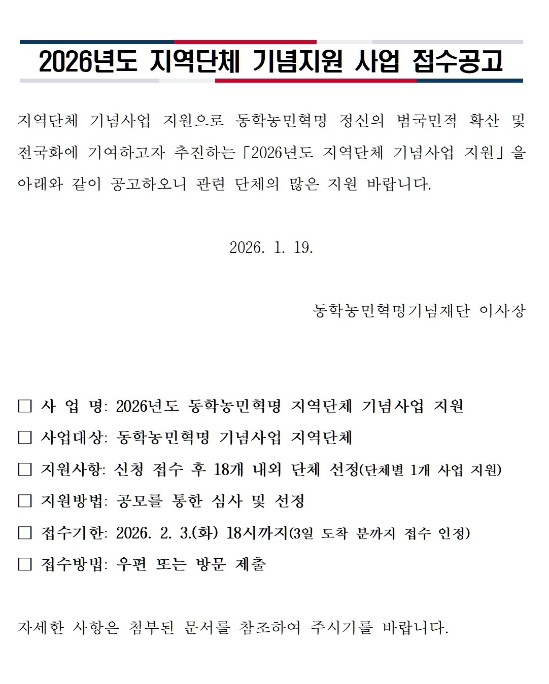 2026년도 지역단체 기념지원 사업 접수공고 공지