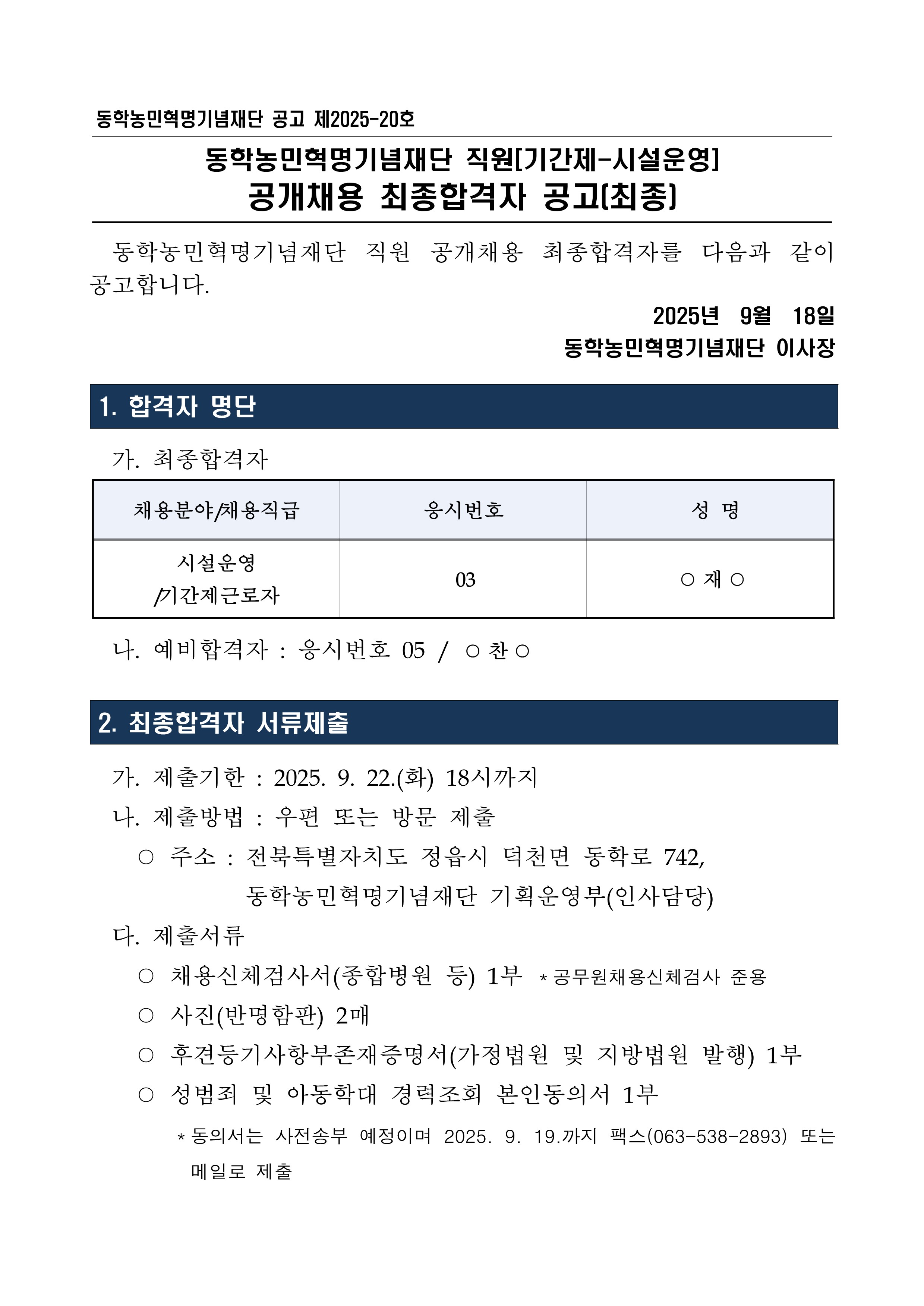 직원(기간제_연수동/캠핑장 시설운영) 공개채용 최종합격자 공고