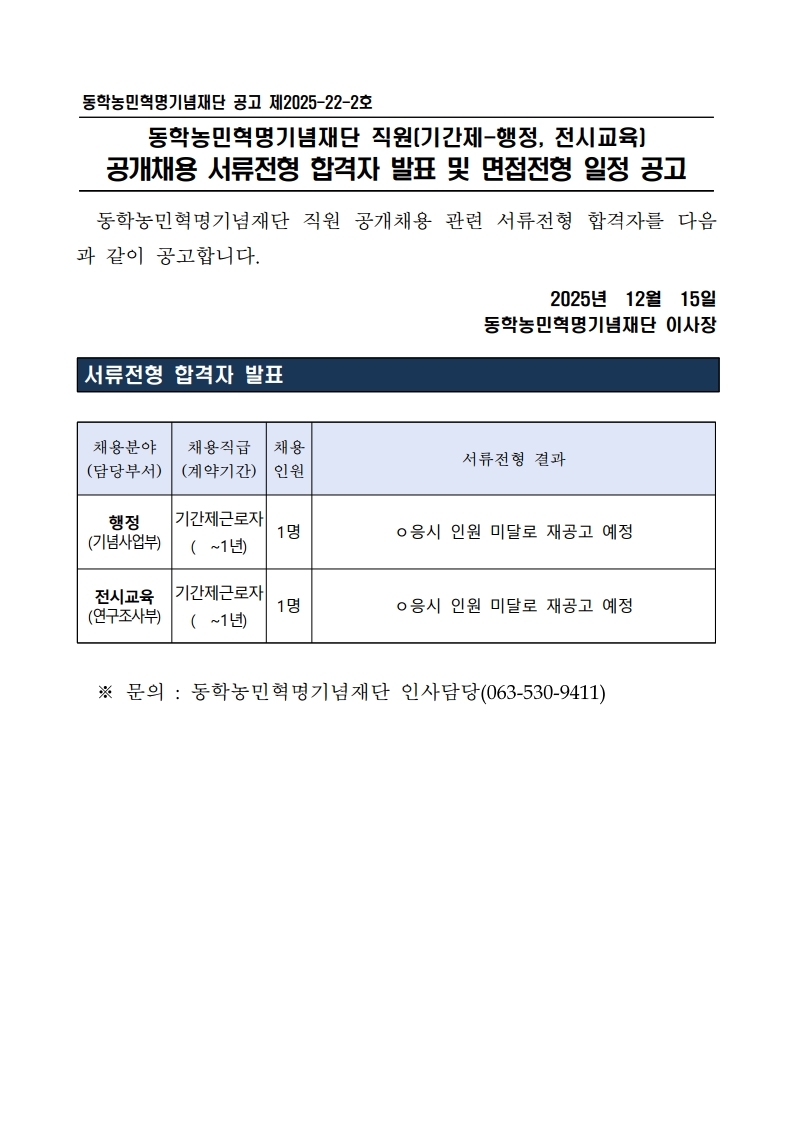 직원(기간제_행정, 전시교육) 공개채용 서류전형 합격자 발표