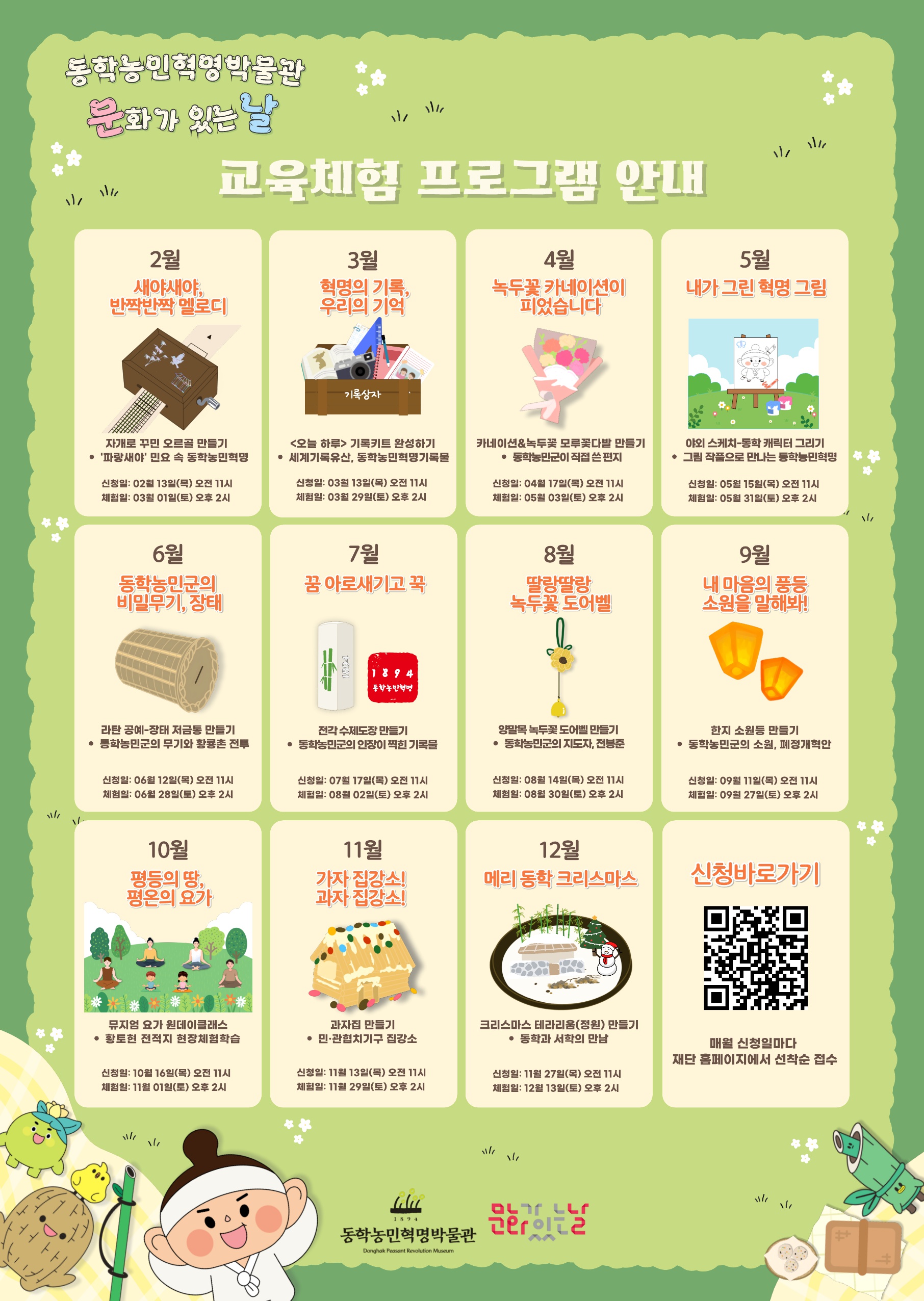 동학농민혁명기념재단은 올해 2월부터 매월 ‘문화가 있는 날’ 프로그램을 정기 운영하며, 동학농민혁명을 주제로 매달 새로운 교구재와 체험활동을 개발해 오고 있다. 매달 진행되는 프로그램은 동학농민혁명의 이야기를 쉽고 재미있게 체험할 수 있도록 기획되어, 매회 선착순 접수가 바로 마감될 만큼 관람객들의 큰 호응을 얻고 있다.