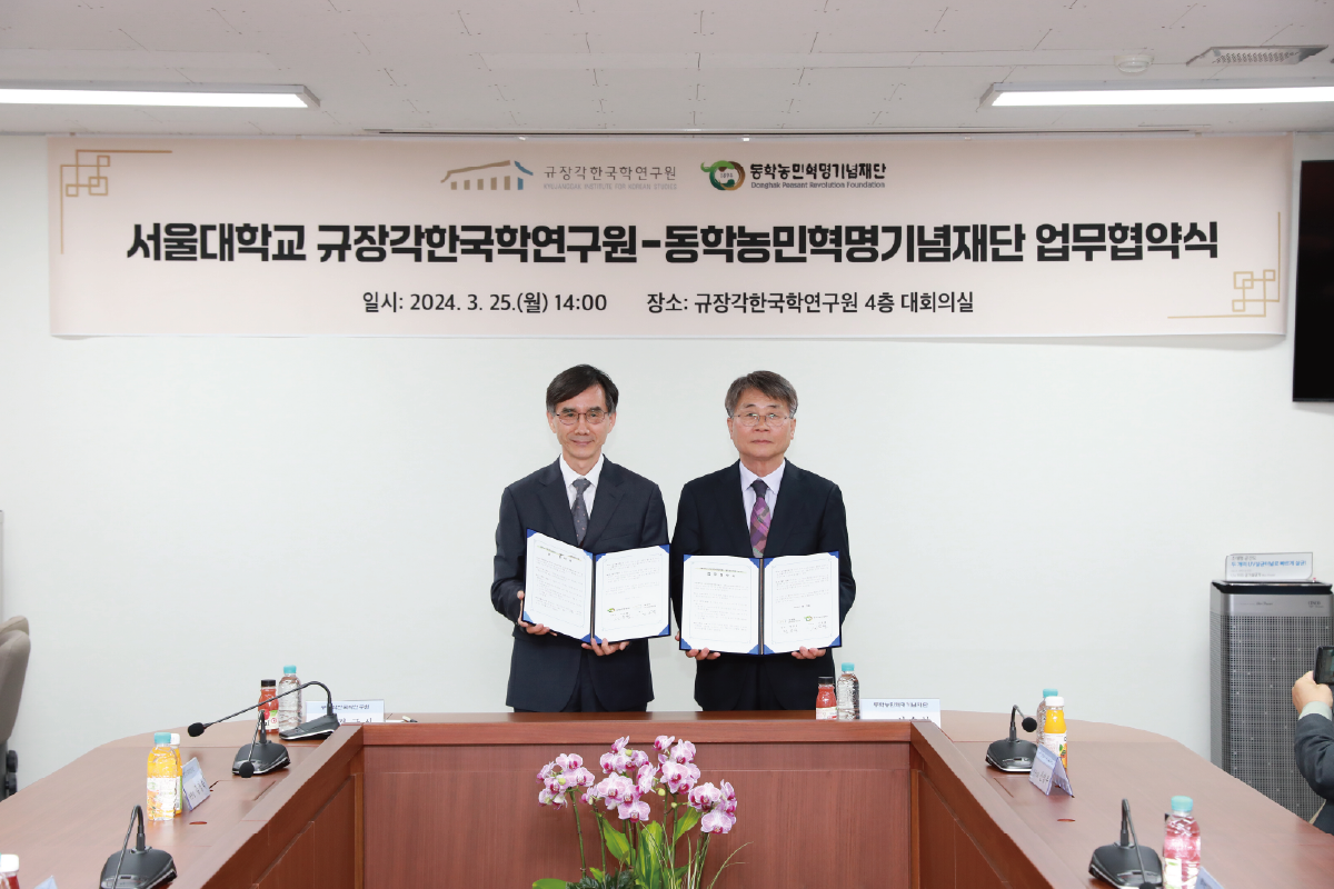 3월 25일 서울대 규장각한국학연구원 대회의실에서 동학농민혁명기념재단(이사장 신순철, 이하 기념재단)과 서울대 규장각한국학연구원(원장 정긍식, 이하 규장각)은 상호간 업무협약(MOU)을 체결하였다. 규장각은 대한민국 국보 8종, 보물 31종, 유네스코 세계기록유산 7종 등 약 25만 종의 유물을 소장하고 있는 대한민국 대표 자료관이자 학술 연구기관이다. 세계기록유산으로 등재된 동학농민혁명기록물은 총 185건으로 이중 기념재단이 66건, 규장각이 58건을 보유하고 있다.