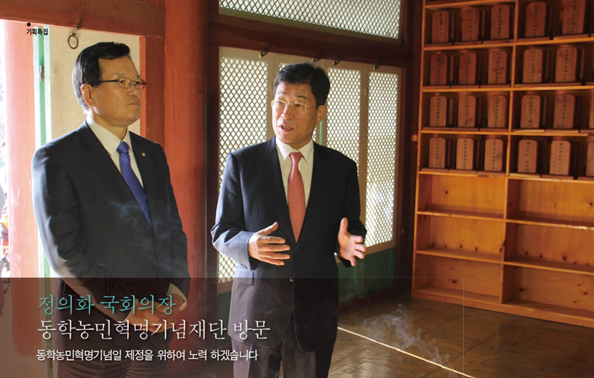 정의화 국회의장(이하 정 의장)은 지난 11월 29일(토) 동학농민혁명 유적지와 동학농민혁명기념재단을 방문했다. 정 의장은 지난 11월 10일(월) 송하진 도지사에게 전라북도의 현안에 관심을 가지고 성원해준 것에 대한 감사의 마음을 담은 전라북도 명예도민증을 수여받는 등 전라북도와 동학농민혁명에 각별한 관심을 보여 왔다.