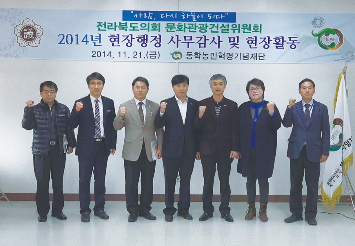 동학농민혁명기념재단은 지난 11월 13일(목) 전라북도의회 행정사무감사를 수감했다. 이성일 전라북도의회 문화관광건설위원회 위원장 이하 7명의 도의원이 참여한 이번 행정사무감사는 기념관의 전시 내용, 동학농민혁명 기념일 제정, 유네스코 세계기록유산 등재 추진, 기념공원 운영비 내역, 자료번역·자료집 발간, 자문위원회 운영, 황토현전적지 운영에 관련한 질의사항이 이어졌으며, 재단에서는 문화관광건설위원회 측에서 요청한 자료를 제출하고, 지적받은 사항에 대해서는 보완 및 수정키로 하였다.