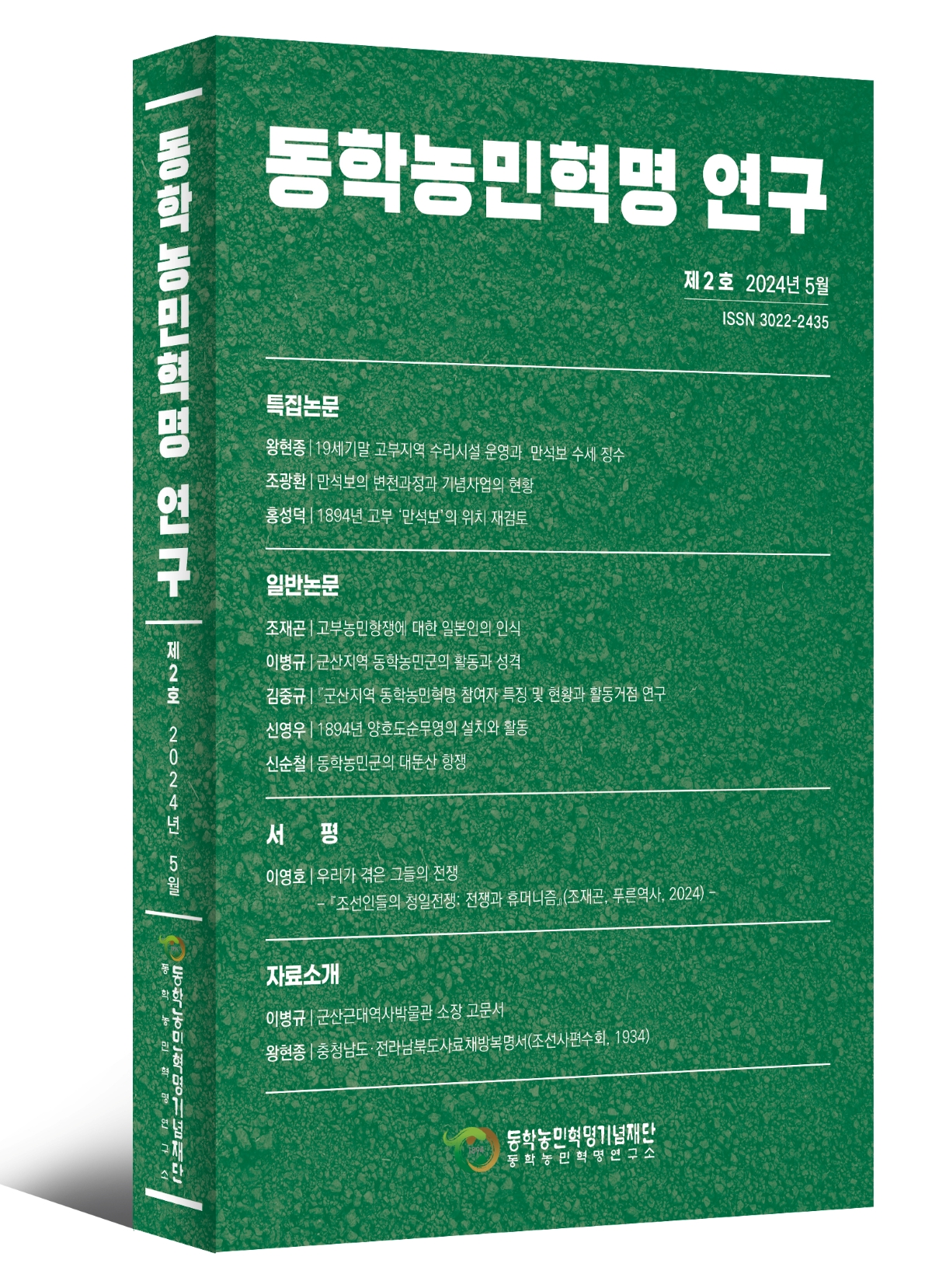 5월 31일 동학농민혁명연구소에서 동학농민혁명 학술지 『동학농민혁명 연구』 제2호를 발간하였다. 지난해 11월 창간호에 이어 두 번째로 발간된 이번 학술지에는 동학농민혁명 관련 특집 논문(3편), 일반 논문(5편), 자료 소개(군산근대박물관 소장 고문서), 연구소 소식, 자료 목록(국역총서, 신국역총서) 등이 수록되었다.