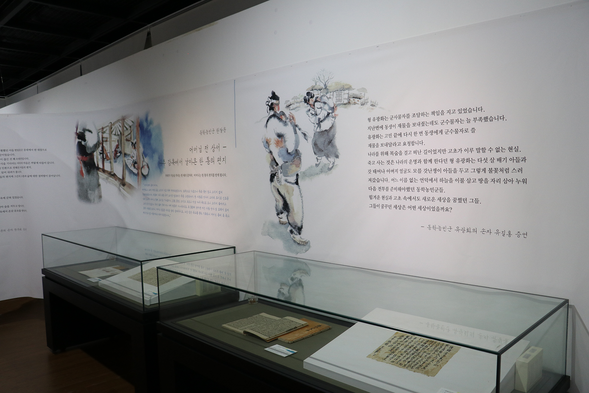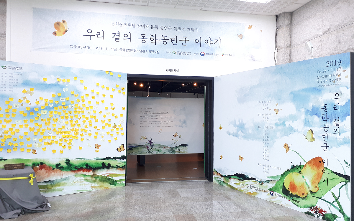 지난 6월 24일 동학농민혁명기념관 기획전시실에서 【동학농민혁명 참여자 유족 증언록 특별전】 “우리 곁의 동학농민군 이야기”라는 주제로 기획특별전을 개막하였다. 2004년 『동학농민혁명참여자등의명예회복에관한특별법』이 제정되고, 특별법에 따라 동학농민혁명참여자명예회복 심의위원회에서 2004년부터 2009년까지 동학농민혁명 참여자 3,644명, 유족 10,567명을 등록하였다. 이번 전시는 조사과정에서 새롭게 확인된 동학농민군들의 활동내용을 중심으로 1차 사료, 재단 및 유족회에서 제작한 유족 증언록 등의 내용을 추가하여 스토리텔링 기법을 통해 동학농민혁명 참여자와 그 유족들의 알려지지 않은 이야기를 한 편의 동화처럼 그려냈다. 전시구성은 총 4부로 삶과 죽음, 남겨진 편지, 그날의 기억, 다시 피어나는 희망 등으로 구성되었다. 동학농민혁명이라는 역사적 순간에 이름을 남기지도 못하고 스러져 가야했던 많은 동학농민혁명 참여자들을 돌아보고, 그동안 자랑스러운 선조들을 그저 가슴속에만 품으며 고난의 세월을 묵묵히 견뎌야만 했던 유족들의 아픔을기억하며, 사람답게 사는 세상을 위해 목숨을 바친 그들의 슬프지만 아름다운 동화를 소주제별로 소개하였다.