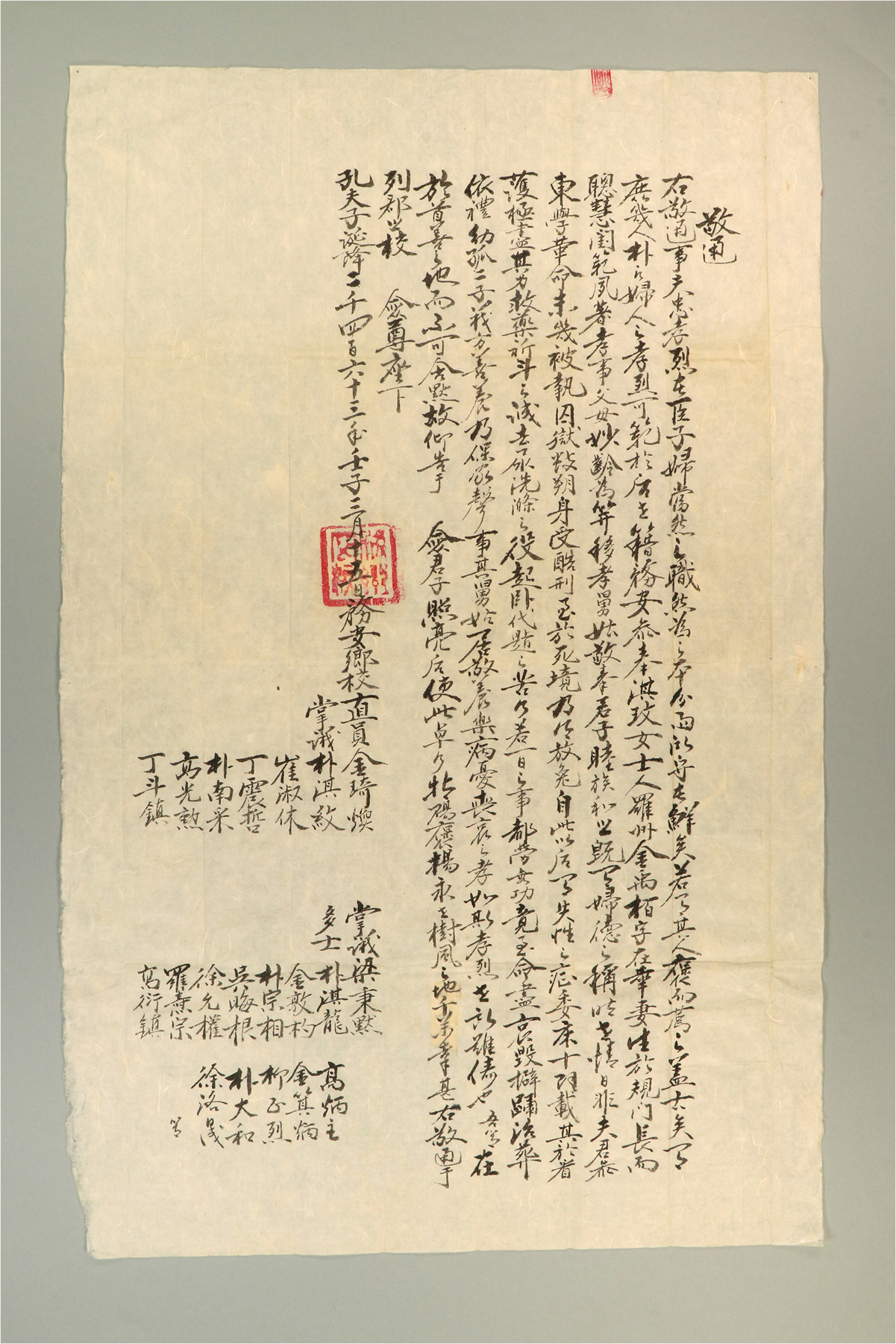 ▲ 동학농민군 김우백 관련 경통 1912년 57.4 × 90.5cm 동학농민혁명기념관_김정완 기증|1912년 무안향교에서 무안 박씨를 포양(褒揚)하기 위해 지역 유림들에게 보낸 통문이다.