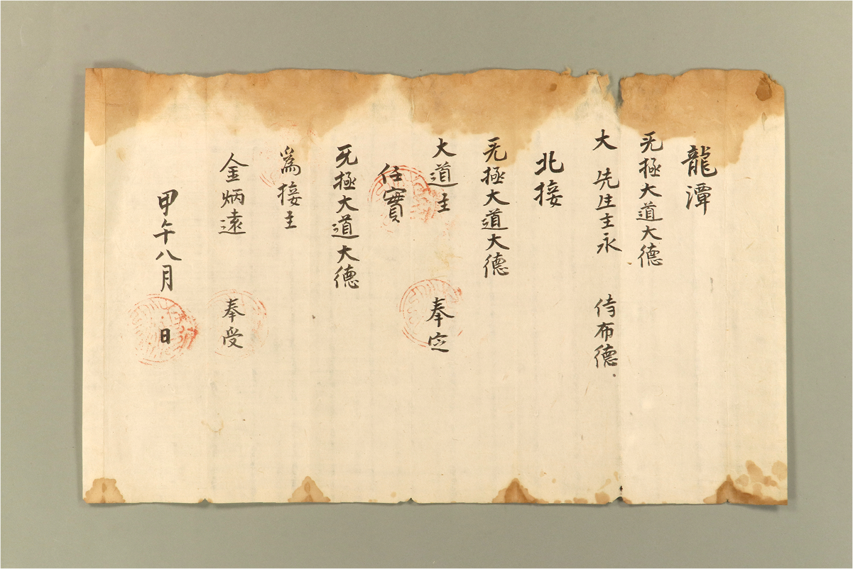 ▣ 동학농민군 김영원 접주 임명장 1894년 25.5 × 41.5cm 김창식 소장|1894년 동학교단에서 김병원(김영원의 다른 이름)을 접주로 임명하는 임명장