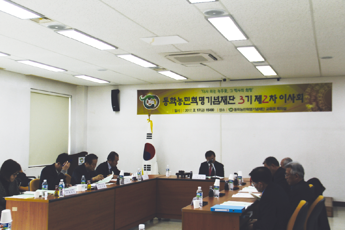 2017년 2월 17일(금) 2016년도 결산안, 규정개정안 등의 심의의결을 위해 ‘동학농민혁명기념재단 3기 제2차 이사회’가 열렸다. 이날 회의에서는 주요 안건 심의 의결 외에 특별법 개정, 국가기념일 제정, 기념공원 조성사업 추진사항 등이 보고되었다.