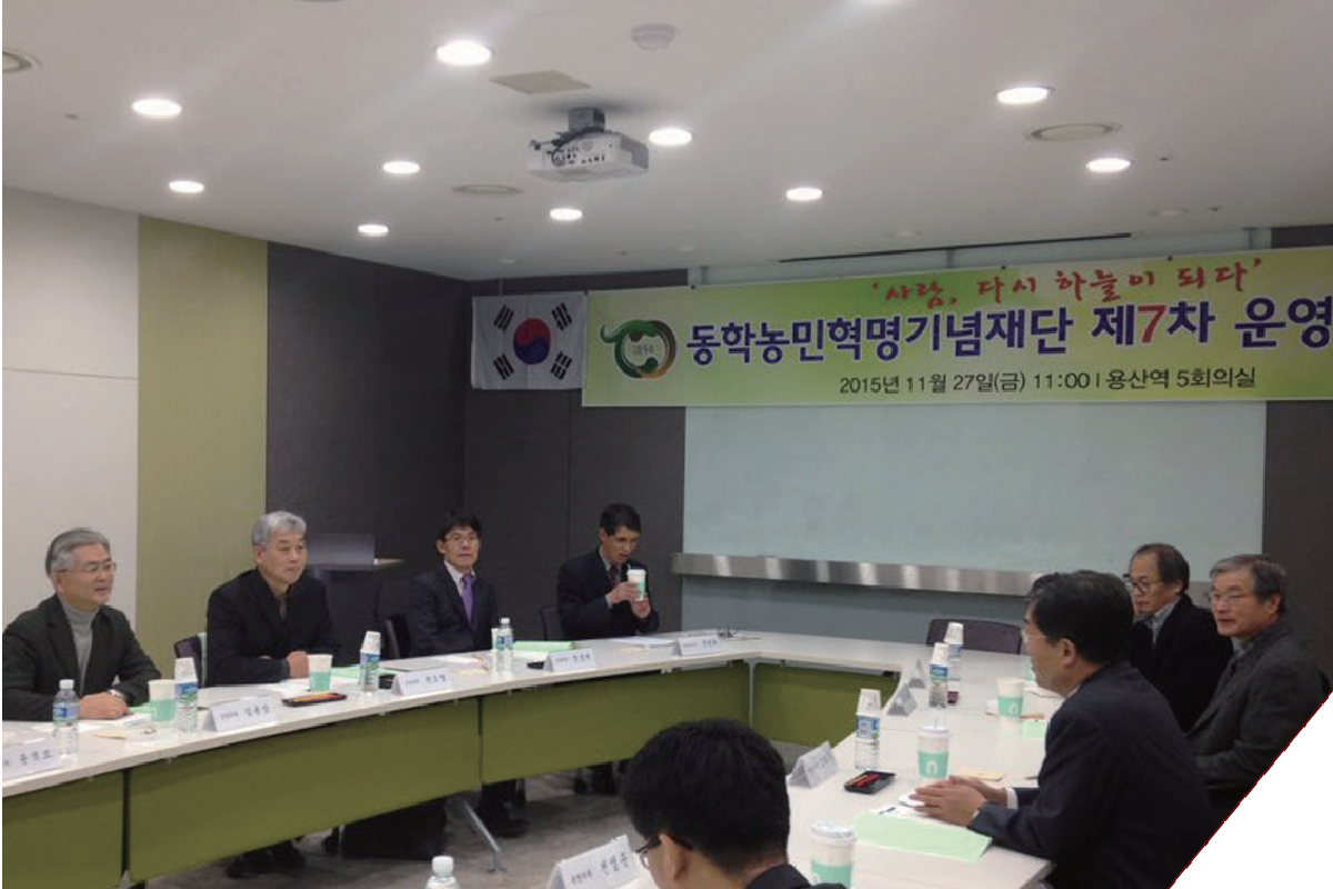 지난 11월 27일(금) 용산역 itx 5회의실에서 동학농민혁명기념재단 2기 제7차 운영위원회가 개최됐다. 이번 운영위원회에서는 2016년도 사업계획 및 예산안을 보고한 후, 동학농민혁명기념공원 조성 추진현황, 동학농민혁명국가기념일제정 추진현황, 동학농민혁명 제122주년 기념대회 개최지역, 동학농민혁명기념관 활성화 방안에 대해 검토했다.