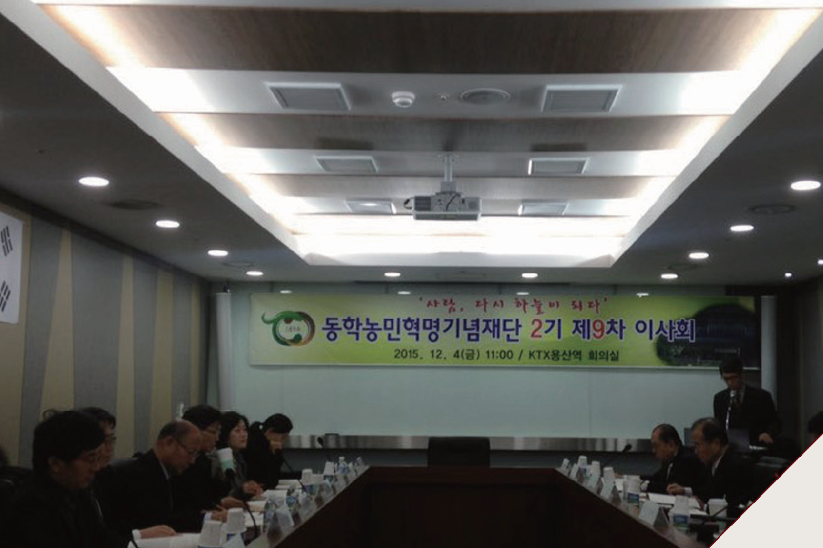 동학농민혁명기념재단 2기 제9차 이사회가 지난 12월 4일(금) 용산역 회의장에서 열렸다. 이번 이사회는 재단의 정관 개정과 2016년도 예산안 및 사업계획에 대해 의결했으며, 동학농민혁명 기념공원 추진현황, 동학농민혁명국가기념일 제정 추진현황, 동학농민혁명기록물 세계기록유산 등재 추진현황에 대해 보고했다.