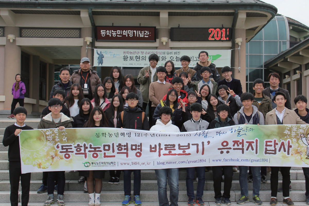 [동학농민혁명 바로보기 유적지 답사] 프로그램이 지난 11월 23일부터 12월 4일까지 고등학교 3학년 학생을 대상으로 총 5회에 걸쳐 이루어졌다. 전라북도교육청의 협조를 통해 전라북도 소재 6개 고등학교(김제고등학교, 지평선고등학교, 덕암고등학교, 설천고등학교, 산서고등학교, 부안여자고등학교)를 답사대상으로 선정한 이번 프로그램은, 청소년들에게 동학농민혁명의 숭고한 정신을 함양하고, 올바른 역사인식을 도모하기 위해 진행됐다.