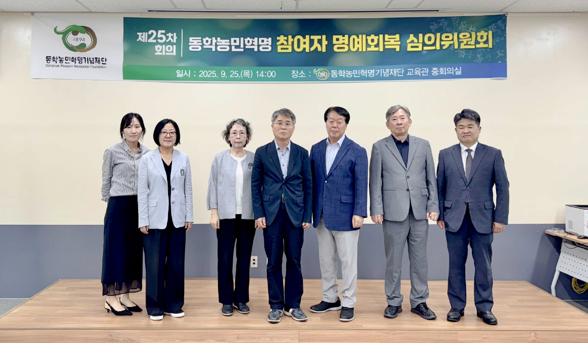 지난 9월 25일, 동학농민혁명기념재단 교육관에서 제25차 동학농민혁명 참여자 명예회복 심의위원회가 개최되었다. 이번 회의에서는 ▲신순철 위원장(동학농민혁명기념재단 이사장)을 비롯하여 ▲구선희(전 국사편찬위원회 편사연구관), ▲김춘성(천도교 선도사), ▲배항섭(성균관대학교 교수), ▲정탄진(사단법인 동학농민혁명유족 회장), ▲이정미(문화체육관광부 문화정책관, 우선희 사무관 대리 참석) 위원이 참석하였다. 이날 회의에서는 총 62건의 안건이 상정되었으며, 그중 동학농민혁명 참여자 60명과 유족 5명이 심의, 의결되었다.
