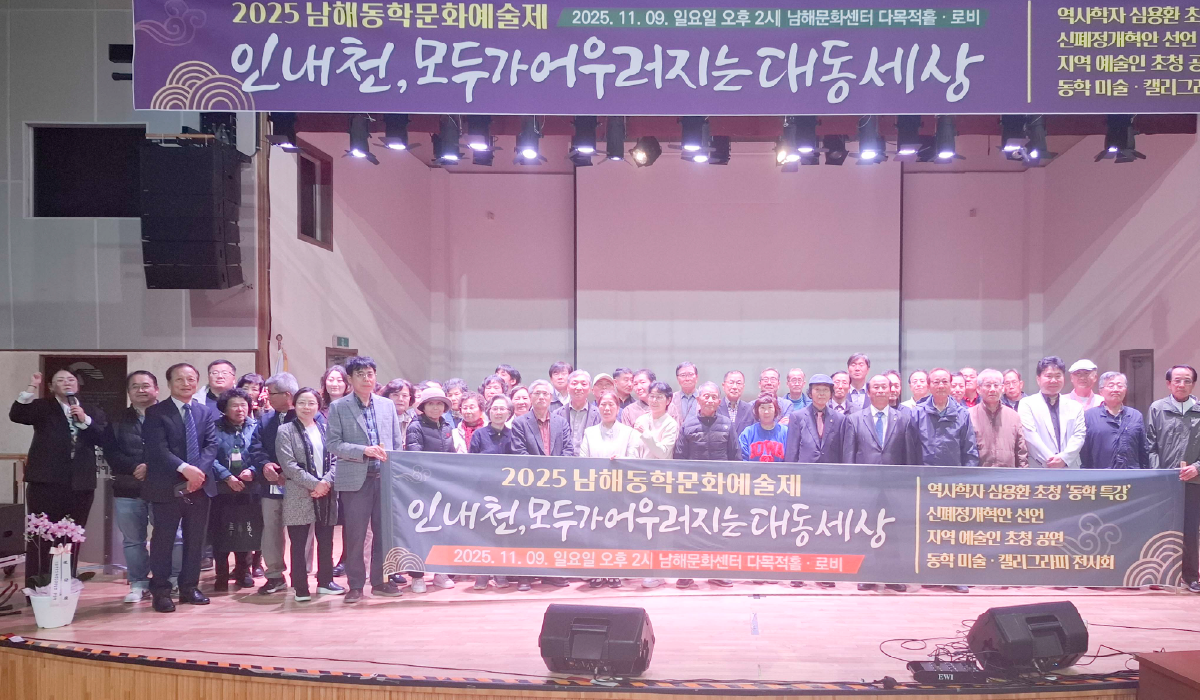 지난 11월 9일 남해문화센터에서 2025 남해동학문화예술제가 개최되었다. 행사에서는 ▲심용환(역사N교육연구소 소장)의 동학 역사 특강과 ▲2025 신폐정개혁안 선언, ▲지역 예술인 초청 공연, ▲동학 미술·캘리그라피 전시회가 진행되며 인내천 정신을 되새겼다. 참가자들은 동학농민혁명의 가치를 체험하며 서로 어우러지는 시간을 가졌다. 이번 행사는 남해군 주최, 남해동학농민혁명기념사업회(회장 김환용) 주관, 천도교 중앙총부 후원으로 열렸다.