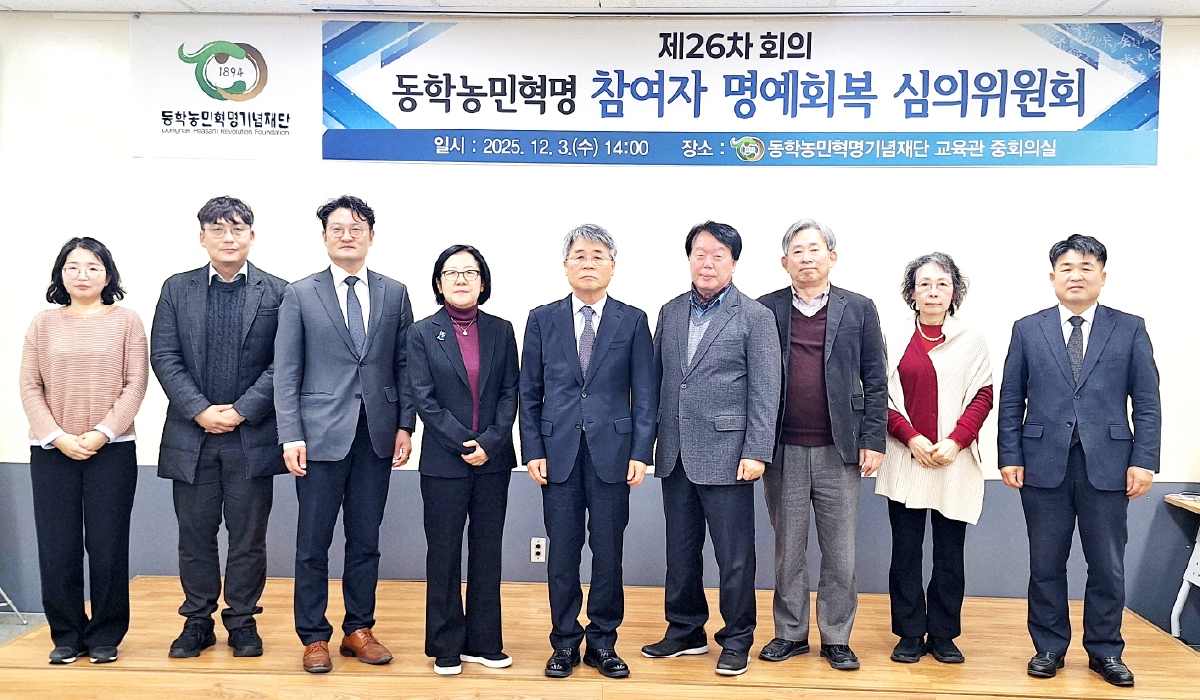 2025년 12월 3일, 동학농민혁명기념재단에서 제26차 동학농민혁명 참여자 명예회복 심의위원회가 개최되었다. 이번 회의에서는 신순철 위원장(동학농민혁명기념재단 이사장)을 비롯하여 구선희(전 국사편찬위원회 편사연구관), 김춘성(천도교 선도사), 배항섭(성균관대학교 교수), 정탄진(사단법인 동학농민혁명유족회장), 이정미(문화체육관광부 문화정책관, 안미정 전통문화과장 대리 참석), 박성민(행정안전부 지방행정국장 직무대리), 이제복(국가보훈부 보훈예우정책관, 류동연 학예연구관 대리 참석) 위원이 참석하였다. 이날 회의에서는 총 36건의 안건이 상정되었으며, 그중 동학농민혁명 참여자 33명과 유족 2명이 심의·의결되었다.