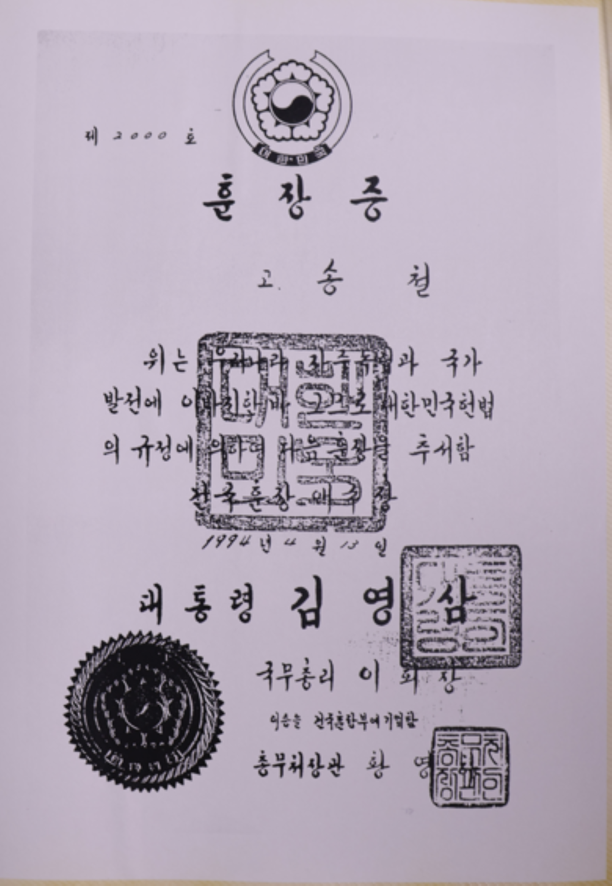 문) 선생님의 말씀을 들으니 당시 처참하고 긴박했던 상황이 눈앞에 그려집니다. 동학농민혁명에 참여했던 참여자들이 그러했듯이 선생님의 증조부님 또한 목숨을 장담하기 어려운 상황에서도 나라를 생각하는 마음이 남달랐던 것 같습니다. 선생님의 집안 내력을 보면 대대로 애국자 집안이신데요. 송학운 증조부님의 아들 (송철), 그러니까 선생님의 할아버지는 또한 독립유공자이시죠? 증조부님과 조부님이 모두 일본 제국주의와 싸운 독립유공자라 할 수 있는데. 할아버지 이야기도 좀 해 주시죠?