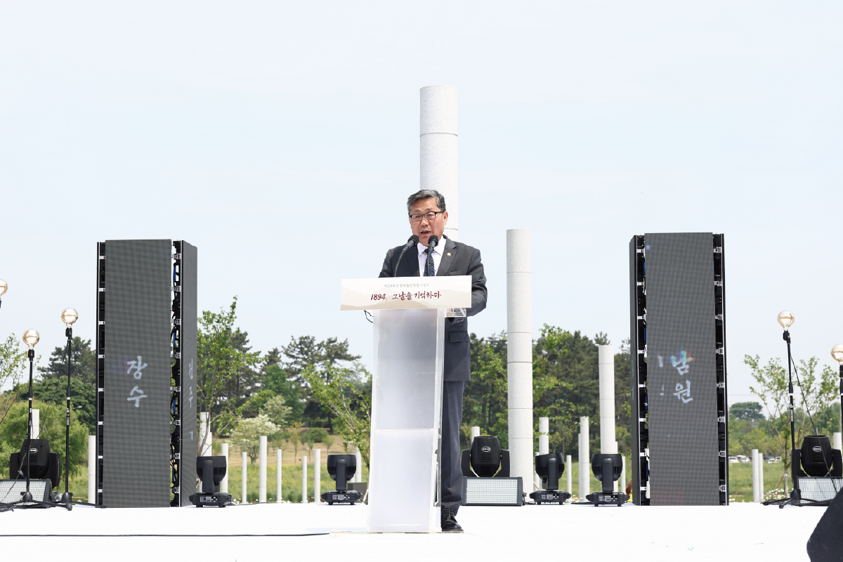 오늘은 동학농민혁명 제129주년이 되는 날입니다. 먼저 삼가 동학농민군 선열님들의 명복을 빕니다. 아울러 동학농민혁명 참여자 유족 여러분께 깊은 경의와 감사의 인사를 드립니다. 또한 동학농민혁명 참여자와 유족의 명예 회복을 위해 늘 힘써 주시는 동학농민혁명유족회 주영채 회장님, 천도교 주용덕 종무원장님, 동학농민혁명기념재단 신순철 이사장님과 유관 단체 대표님들과 관계자 여러분께도 감사드립니다. 그리고 동학농민혁명 정신 선양 사업에 뜻을 같이해주신 국회 윤준병 의원님, 전라북도 임상규 행정부지사님, 이학수 정읍 시장님, 오늘 자리를 빛내주고 계신 내빈 여러분께도 감사의 마음을 전합니다.