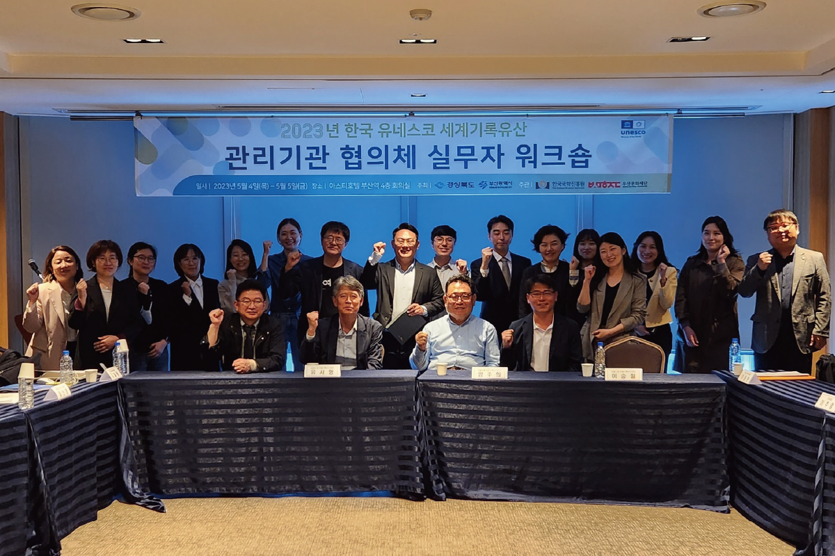 2023년 5월 4~5일 부산 아스티 호텔에서 ‘2023년 한국 유네스코 세계기록유산 관리기관 협의회 실무자 워크숍’이 개최되었다. 2018년 시작되어 올해로 6회째를 맞은 워크숍은 경상북도와 부산광역시가 주최하고, 한국국학진흥원과 부산문화재단이 주관하였다. 이번 행사에는 주관기관인 한국국학진흥원과 부산문화재단, 2023년 유네스코 세계기록물 등재 확정을 앞둔 동학농민혁명기념재단과 4·19혁명 세계기록유산등재추진위원회를 비롯하여 간송미술재단, 국가기록원, 서울대학교 규장각한국학연구원 등 17개 한국 유네스코 세계기록유산 관리기관 및 유관기관의 실무자들이 참석하여 기관별 실적보고와 공동사업을 모색하고 협력방안 등을 논의하였다.
