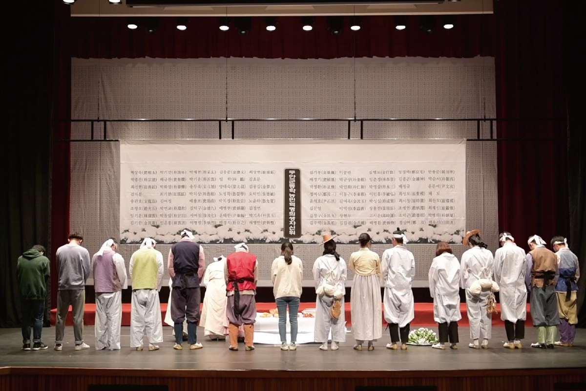 답) 2011년 8월 유족회와 뜻있는 무안군민들이 모여 동학의 자료발굴과 기념사업, 그리고 정신계승이라는 3가지 큰 목적을 가지고 무안군동학농민혁명기념사업회(이하 무안기념사업회)가 만들어졌습니다. 가장 먼저 시작한 사업이 제폭구민과 척양척왜를 외치다 구천에 외롭게 쓰러져간 혁명 전사들의 넋을 위로하고 그 뜻을 기리는 위령제를 지내는 일이었는데 지금까지 매년 해오고 있습니다. 2013년에는 무안지역의 동학의 역사를 발굴하고 자료를 수집하는 일환으로 목포대학교에 의뢰하여 ‘무안군동학농민혁명 역사성 고증 및 기념사업 기본계획 수립’에 대한 용역사업을 실시하였고 2017년에는 목포대 고석규 전 총장, 배항섭 교수 등 전국의 동학 전문가들을 모시고 학술세미나를 개최하는 등 무안군의 동학 역사 찾기에 심혈을 기울였고, 앞으로의 기념사업에 대한 방향을 잡아가는 작업을 하였지요. 2015년부터는 목포대학교, 무안고등학교, 해제중학교 학생들을 중심으로 동아리를 꾸려 연구활동을 하며 커나가는 학생들을 상대로 정신선양사업을 진행해오고 있습니다. 특히 무안고등학교 학생들은 2018년부터 2020년까지 3년간 직접 연극을 만들어 승달예술회관 대공연장 무대에 올렸는데 함께 공연을 관람한 지역주민들이나 학생들, 그리고 학교 선생님들에게까지 큰 울림으로 남았던 기억이 생생합니다. 학교 교장선생님은 일본군 역, 저는 배상옥 장군 역을 하며 직접 연극에 참여를 했는데 학생들에게 큰 가르침이 되지 않았나 생각이 됩니다.