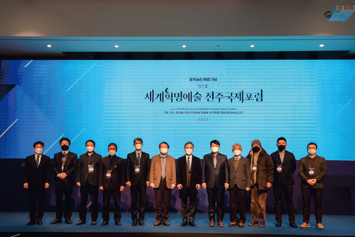 지난 2022년 1월 21일 전주시 주최로 동학농민혁명기념 제1회 세계혁명예술 전주국제포럼이 전주 라한호텔에서 열렸다. ‘혁명의 예술, 근대혁명 도시들의 문학과 영화’를 부제로 마련된 이날 포럼은 박명규 서울대학교 명예교수의 기조강연 『문명전환기 혁명의 기념과 재현 : 미래로 열린 과거의 상상』으로 시작되었다. 이어서 제1부「한국의 동학농민혁명과 일본의 근대혁명기 문학관」에서는 먼저, 한국의 동학농민혁명과 관련하여 ‘한국 현대문학에 나타난 동학농민혁명’이라는 문병학(시인, 동학농민혁명기념재단 기념사업부장)의 주제발표가 있었고, 다음으로 일본의 근대혁명기 문학관과 관련하여 ‘시바료타로와-타올라라 검’이라는 요코시마 고지(일본 삿포로대학 교수)의 주제발표가 있었다. 제2부「독일농민전쟁과 러시아의 혁명문학과 영화」에서는 먼저, 독일농민전쟁과 관련하여 ‘독일영화 속의 사회주의 운동과 독일농민전쟁’이라는 토마스 뮐러(뮌하우젠 박물관장)의 주제발표가 있었고, 다음으로 러시아의 혁명문학과 영화에 관하여 ‘알렉세이 톨스토이의 소설-고뇌 속을 가다’라는 엘레나 이코니코바(사할린 국립대학 교수)의 주제발표가 있었다. 제3부「아일랜드 농민혁명과 체 게바라의 혁명문학 및 영화」에서는 먼저, 아일랜드 농민혁명과 관련하여 ‘영화에 묘사된 아일랜드의 혁명과 인물’이라는 퀴바 닉 고바이드(영국 셰필드대학 교수)의 주제발표가 있었고, 다음으로 체 게바라의 혁명문학 및 영화와 관련하여 마틴 게바라 두아르떼(작가, 체 게바라 연구가)의 발표가 있었다.