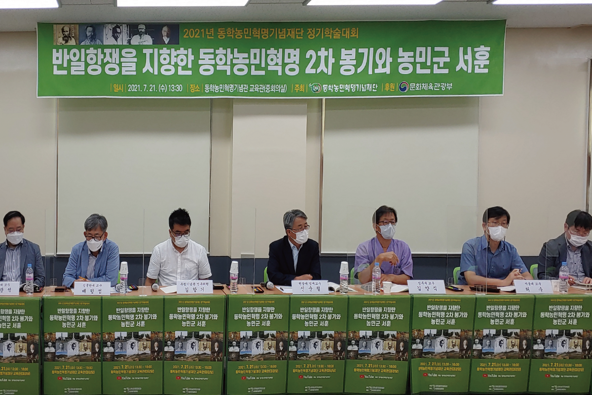 지난 7월 21일 동학농민혁명기념재단 주최, 문화체육관광부 후원으로 ‘반일항쟁을 지향한 동학농민혁명 2차 봉기와 농민군 서훈’이라는 주제 아래 2021 동학농민혁명기념재단 정기학술대회가 열렸다. 코로나19 확산 방지를 위해 유튜브 생중계(채널: 동학농민혁명기념재단)로 진행된 이날 학술대회는 이형규 동학농민혁명기념재단 이사장의 대회사, 주영채 동학농민혁명유족회 회장의 축사로 시작되었다.