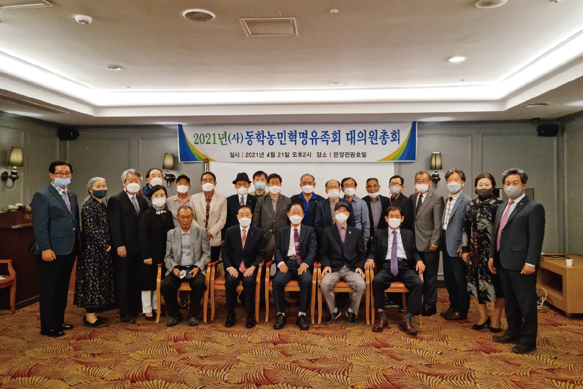 지난 4월 21일 아산에서 (사)동학농민혁명유족회 대의원 총회가 열렸다. 이 날 회의에서는 2020년 업무추진 경과보고, 2021년 사업계획 보고와 함께 전임 이사장 및 이사 해임의 건, 비상대책위원장 및 신임 이사장 선임의 건, 2020년 결산 및 감사보고의 건 등을 심의·의결하고, 제3대 (사)동학농민혁명유족회 임원진과 대의원을 임명하였다. 임원으로 이사장 주영채, 감사 최정길·이정일, 이사 정해곤(사무총장)·김범중·김창식·문영식·박종호·심재식·이정태·송영례·정탄진·함기영을 각각 임명되었으며, 대의원으로는 강성진(광주), 김수호(인천), 김영웅(대전), 박난수(예산), 송기평(정읍), 송옥희(서울), 송준호(청양), 이길로·이용로(전주), 이의석(홍성), 이원하(공주), 이정렬(장흥), 임영섭(안양), 조영범(태안), 최고원(김제), 최기주(임실), 최이기·황대규(아산), 황동우(고창) 등을 각각 임명되었다.