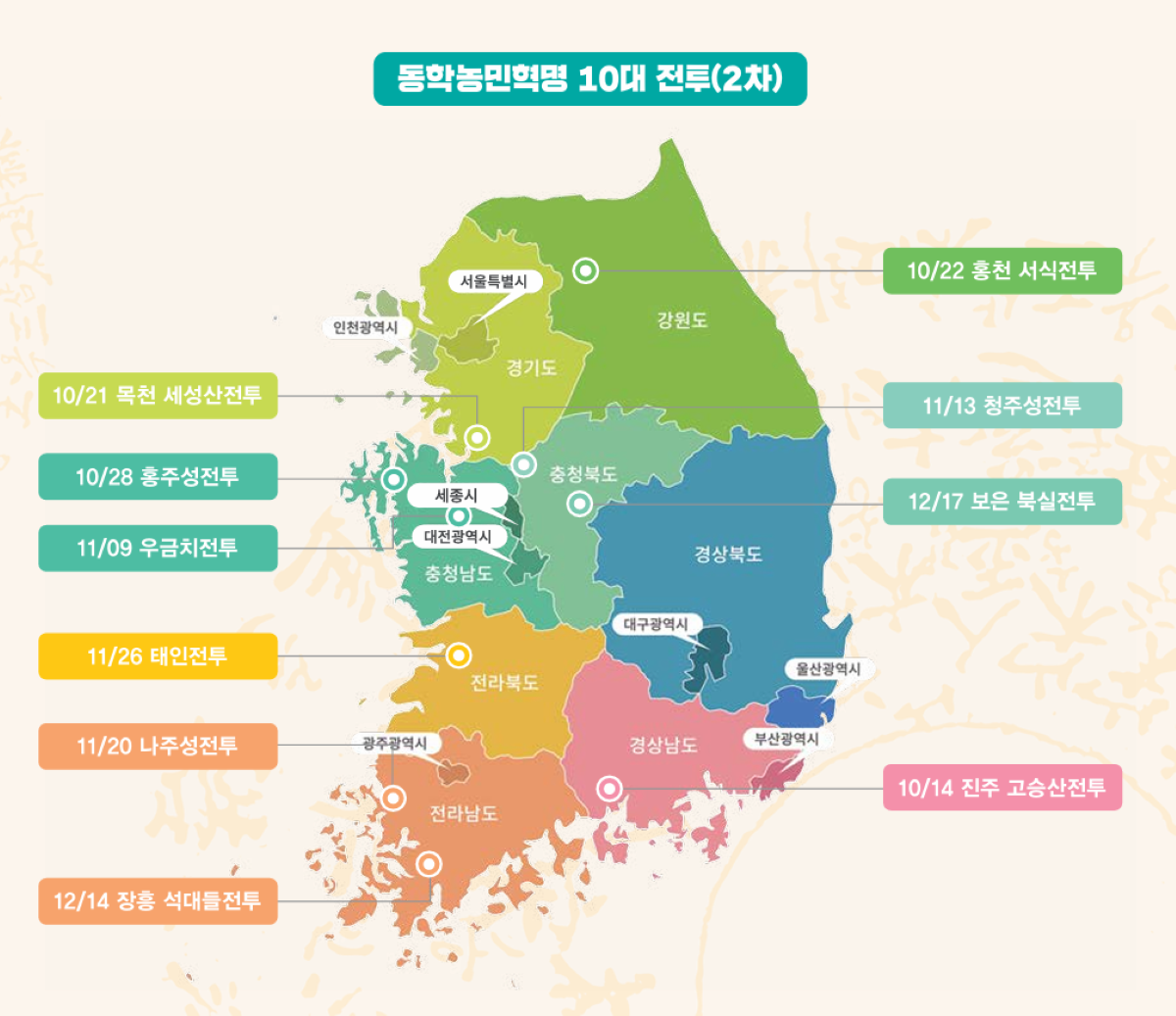 제2차 동학농민혁명은 한 마디로 항일의병전쟁이었다. 동학농민군 스스로 자신들을 의병이라 칭하였으며, 동학농민군의 주적은 일본군이었다. 특히 갑오년 10월부터 12월까지 3개월 동안 전국적으로 대규모의 전투가 벌어졌으니, 이 시기 전개된 동학농민혁명 10대 전투는 다음과 같다.