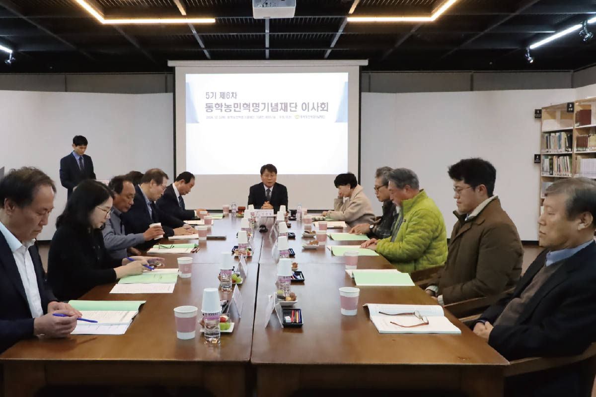 2024년 12월 5일(목) 동학농민혁명기념재단 세미나실에서 5기 제6차 이사회가 열렸다. 먼저 2024년도 정신 선양사업 추진현황과 동학농민혁명기록물 세계기록유산 홍보사업 등이 보고되었다. 이어 2025년 예산 및 사업계획 수립안이 원안대로 심의 의결되었다.