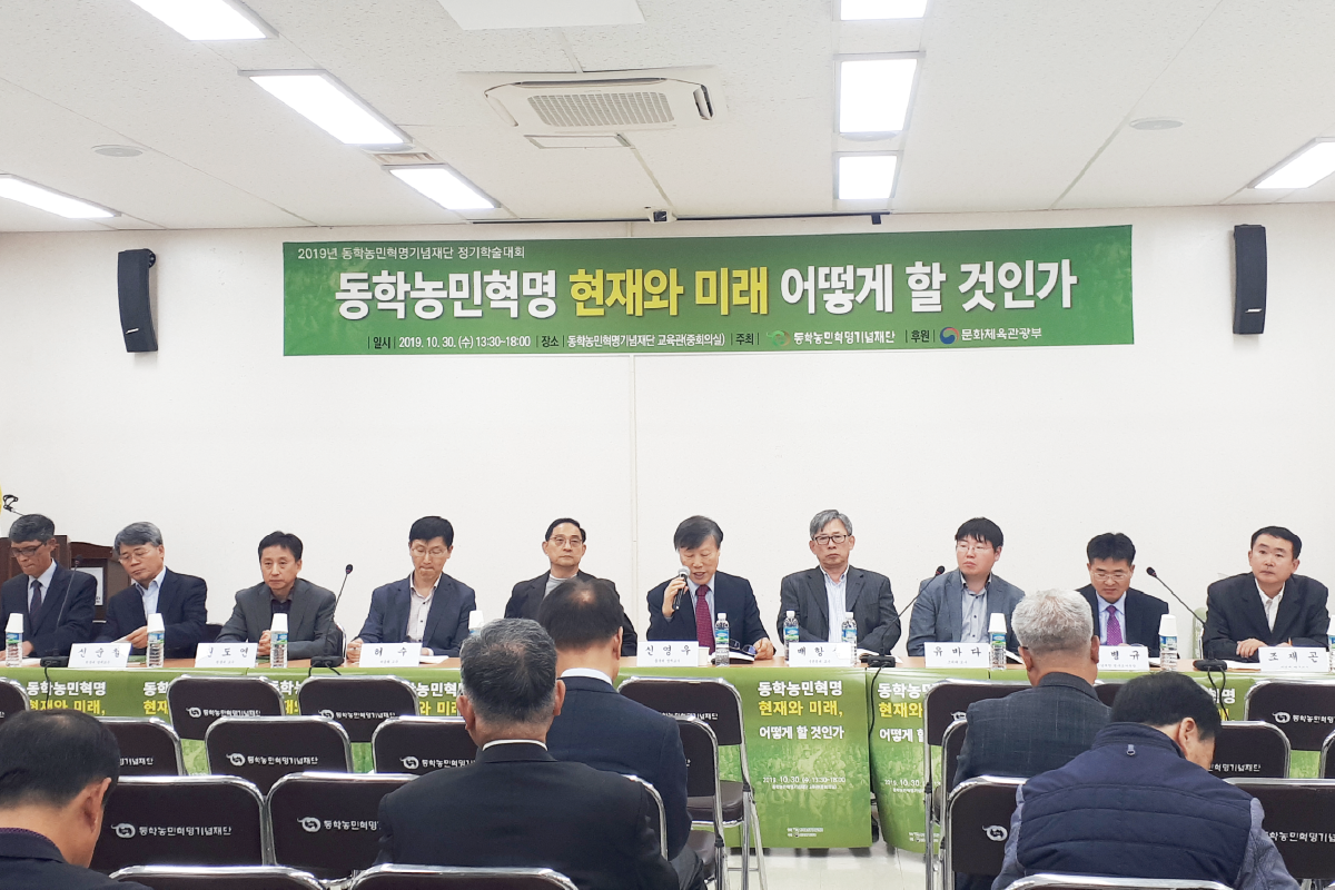 지난 10월 30일 재단 교육관에서 동학농민혁명기념재단 정기학술대회가 “동학농민혁명 현재와 미래, 어떻게 할 것인가”라는 주제로 개최되었다. 이날 학술대회는 이이화 역사학자(전 동학농민혁명기념재단이사장)의 ‘동학농민혁명의 역사’라는 기조강연에 이어 조재곤(서강대 연구교수)- ‘동학농민혁명 국외자료 현황과 활용방안’, 배항섭(성균관대 교수)- ‘동학농민혁명 연구현황과 미래 가치화’, 원도연(원광대 교수)- ‘국가기념일 제정 이후 동학농민혁명 기념사업의 기본방향’ 등 3명의 주제발표가 있었다. 신영우 충북대 명예교수가 좌장을 맡은 종합토론은 이병규(기념재단 연구조사부장), 유바다(고려대 교수), 고석규(목포대 명예교수), 허수(서울대 교수), 신순철(원광대 명예교수), 문병학(기념재단 기념사업부장) 등이 토론자로 참여하였다.
