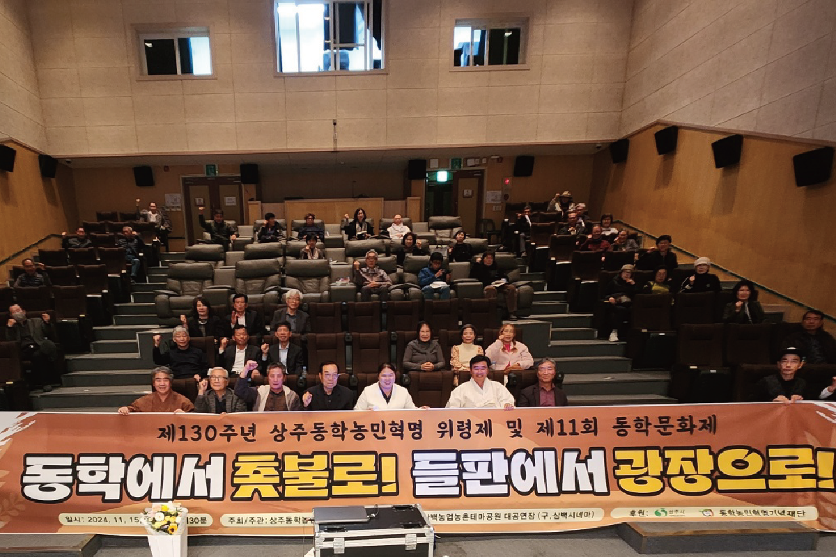 지난해 11월 15일 경북 상주시 삼백농업농촌테마공원 대공연장에서 상주동학농민혁명 130주년 위령제 및 제11회 동학문화제가 열렸다. ‘동학에서 촛불로! 들판에서 광장으로!’라는 주제로 열린 이날 행사는 동학농민혁명군 주먹밥 만들기, 판화 탁본 체험, 판화작품전 등으로 시작하였다. 본 행사는 리베오카리나 앙상블의 식전공연, 김종환 상주향토문화연구소장의 <상주 동학농민혁명의 전개와 의의> 기념특강, 진혼무, 위령제, 판굿, 시낭송, 퓨전국악 식후 공연 순으로 진행되었다. 이날 행사에는 상주시 및 기념단체 관계자, 동학농민혁명유족회 회원을 비롯하여 지역민 100여 명이 참석하였다.