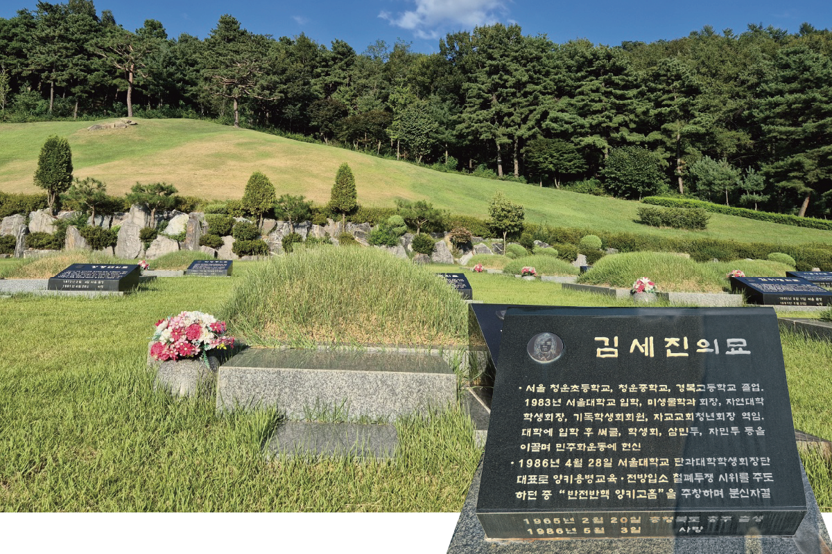 답) 벌써 38년이나 지났네요. 우리 세진이가 1983년 봄에 서울대 미생물학과에 입학해서 4학년 때는 자연대학 학생회장까지 맡았어요. 그때가 정치적인 억압이 아주 극심했어요. 우리 사회 곳곳에 군사문화가 아주 곳곳에 똬리를 틀고 있었잖아요? 그 하나로 당시에는 대학생들이 의무적으로 전방 군부대로 들어가 일정 기간 군사훈련을 받아야 했어요. 공부하는 대학생들을 군부대에 입소시켜 군사훈련을 받게 하는 것이 상식적으로 말이 됩니까? 이 말도 안 되는 상황을 대학생들이 거부하는 건 당연한 일이잖아요. 그런 사회적인 상황에서 1986년 4월 28일 지금도 그날을 못 잊습니다. 어찌 잊을 수가 있겠어요. 그날 서울특별시 신림동 사거리에서 대학생 군사훈련 반대 시위가 크게 열렸어요. 시위 도중 곤봉을 든 사복경찰들이 건물로 진입하자 우리 세진이가 옥상으로 올라가 온몸에 휘발유를 붓고 제 몸에 스스로 불을 붙인 채 “반전반핵 양키고홈” 구호를 외치며 시위군중이 있는 아래로 뛰어내렸어요. 몸에 붙은 불을 끄고 급히 한강 성심병원으로 옮겨서 치료했지만.... 닷새 후 숨을 거두고 말았습니다.... 그래서 우리 세진이를 경기도 광주 판교공원묘지에 묻었지요. 그런데 2000년 「민주화운동관련자 명예회복 및 보상에 관한 법률」이 제정되었어요. 그 법에 따라 이천시에 민주화운동기념공원 조성사업이 추진되었고, 2016년 6월 9일 개원했어요. 그래서 우리 세진이를 민주화운동기념공원으로 옮겼지요.