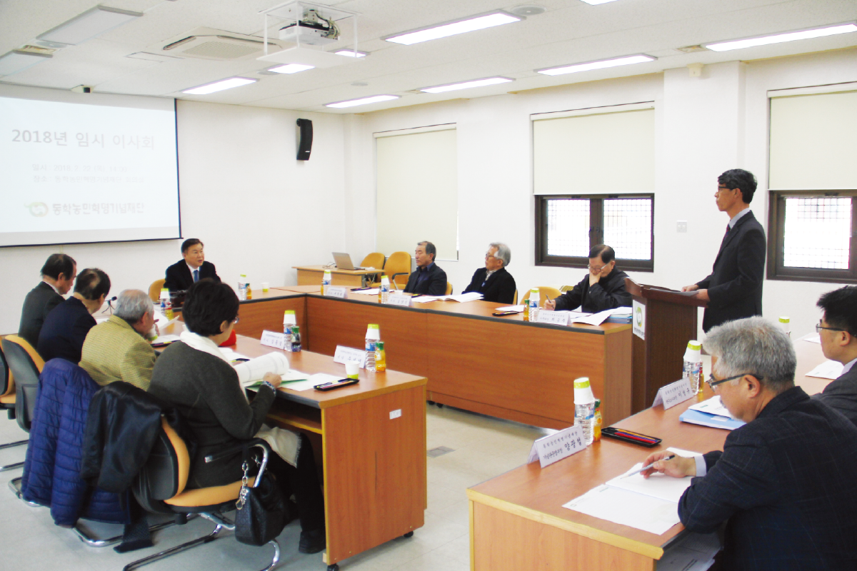 2월 22일(목) 동학농민혁명기념재단 교육관 회의실에서 이사회가 열렸다. 이날 회의에서는 ’17년 결산안 및 보수 규정 개정안이 심의·의결 되었고 동학농민혁명 특별법 개정사항, 국가기념일 제정 추진상황, 기념공원 조성 추진현황, 세계기록유산 등재 추진현황 등이 보고되었다.
